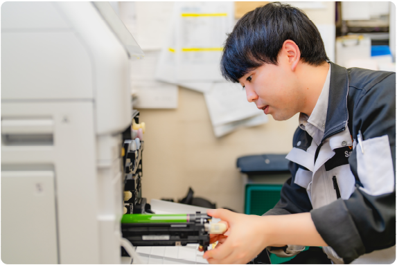 画質のチェックや清掃のほか、各部品の状態を見て手配も行います。点検以外にも、画質の異常や紙詰まり、スキャンが使えないなど、お客様からの問い合わせにもその都度出向いて対応しています。また、必要に応じてはPCの設置作業や修理などもしていたりします。